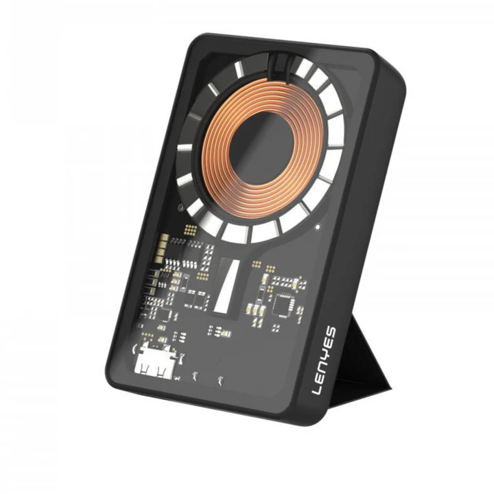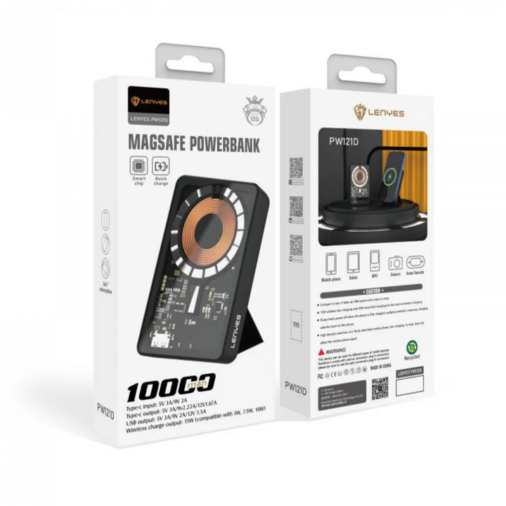 The Lenyes PW121D is a 10000mAh MagSafe-compatible power bank featuring a transparent design and built-in stand. It supports PD 20W fast charging via Type-C and offers wireless charging up to 15W, making it ideal for users seeking a versatile and stylish charging solution.